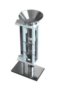 斯科特容量計(jì)法測(cè)試松裝密度是指把粉末放入上部組合漏斗中的篩網(wǎng)上,自然或靠外力流入布料箱,交替經(jīng)過(guò)布料箱中的四塊傾斜角為25°的玻璃板和方形漏斗,最后流入已知體積的圓柱杯中,呈松散狀態(tài)。然后稱量圓柱杯中的粉末的質(zhì)量計(jì)算所得之密度值。