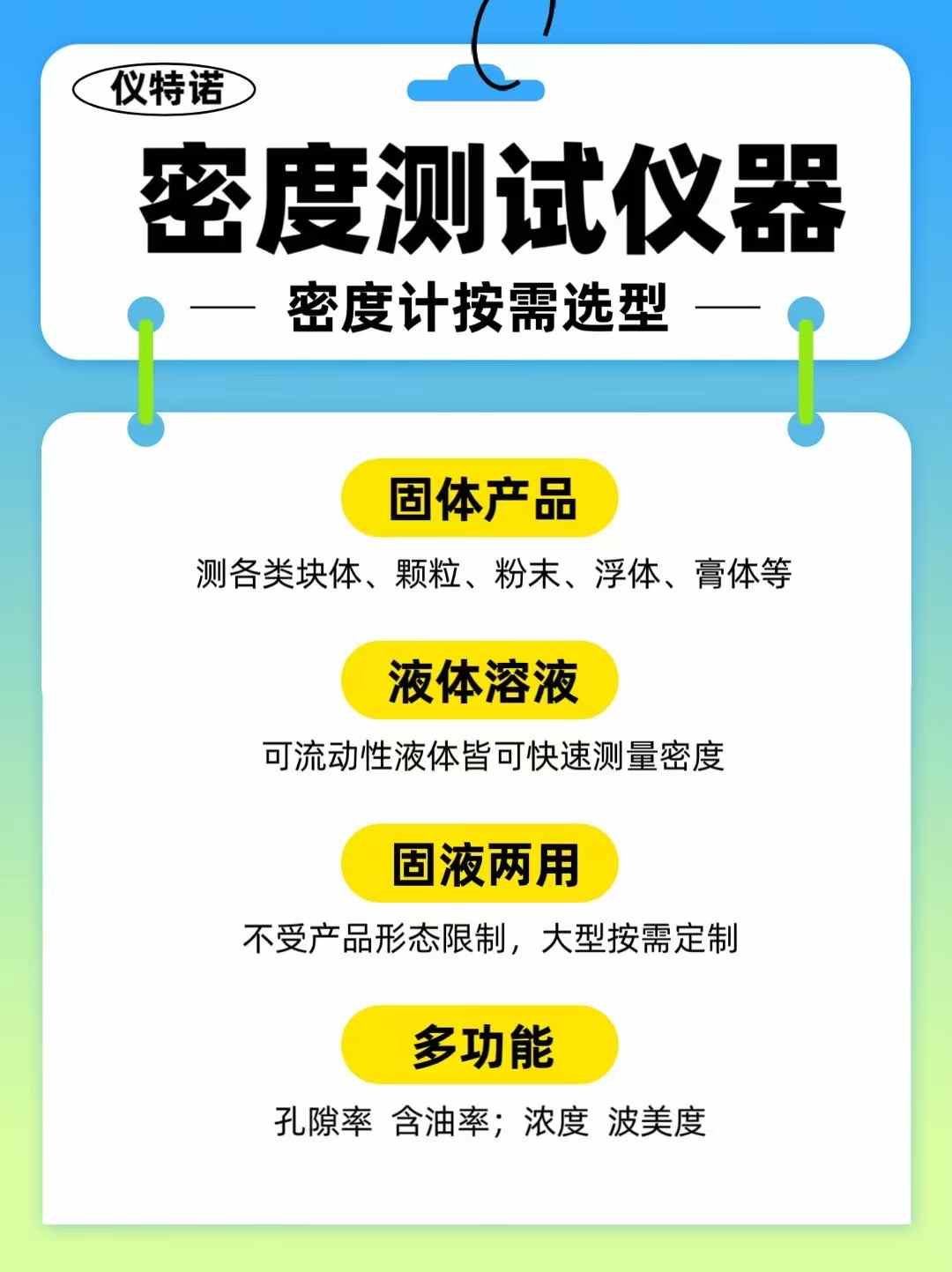 除了高粘度液體,儀特諾液體密度測(cè)量?jī)x系列儀器還可測(cè)量流動(dòng)性液體、揮發(fā)性液體、腐蝕性液體、高溫液體、懸浮液、乳化液、酸堿液體等,滿足各類液態(tài)溶液的密度檢測(cè)需求,并符合GB/T 611 、GB/T 5526 、GB/T11540、GB/T29617-2013、GB/T12206、GB/T5518等國(guó)家標(biāo)準(zhǔn)。