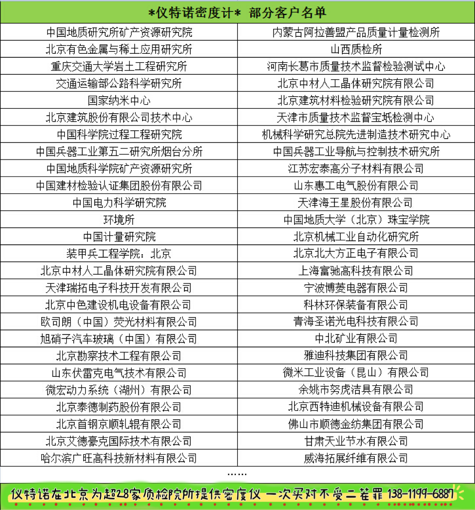 源頭廠家,實力在我。儀特諾在北京為超28家質檢院所、985/211高校提供密度測試儀器,一輩子的事業,持續做好產品質量與服務,我們一直在路上...歡迎隨時聯系,把你的需求告訴儀特諾,為你提供專業的密度測量解決方案。